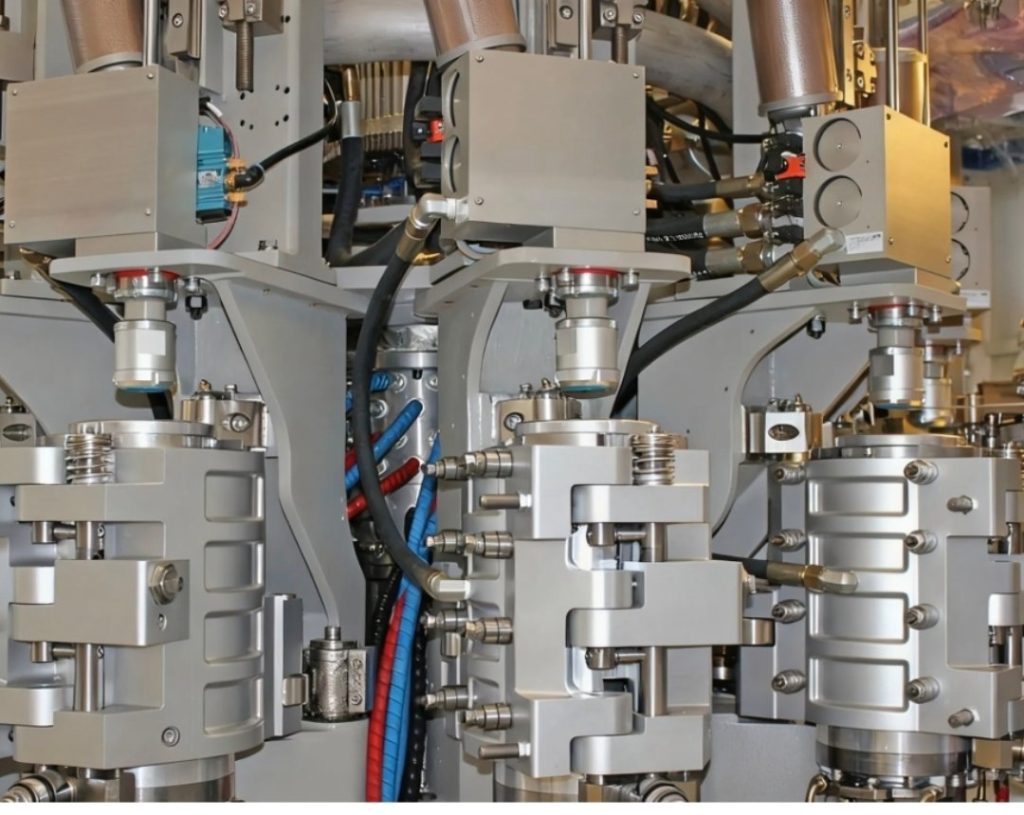 📌 A Combi Block PET blowing machine is an all-in-one machine that both injects PET preforms and blows them into bottles in a single system. This combines preform production and bottle blowing into one streamlined process.